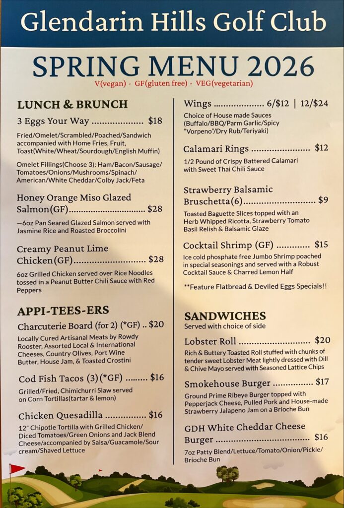 Nestled alongside our rolling hills, Glendarin Hills golf course restaurant offers more than just a delicious meal—it’s an experience. Enjoy fresh, responsibly sourced dishes made to impress. With a spacious patio overlooking parts of 4 holes, there’s no better place to unwind, dine, and drink in the beauty of the game.